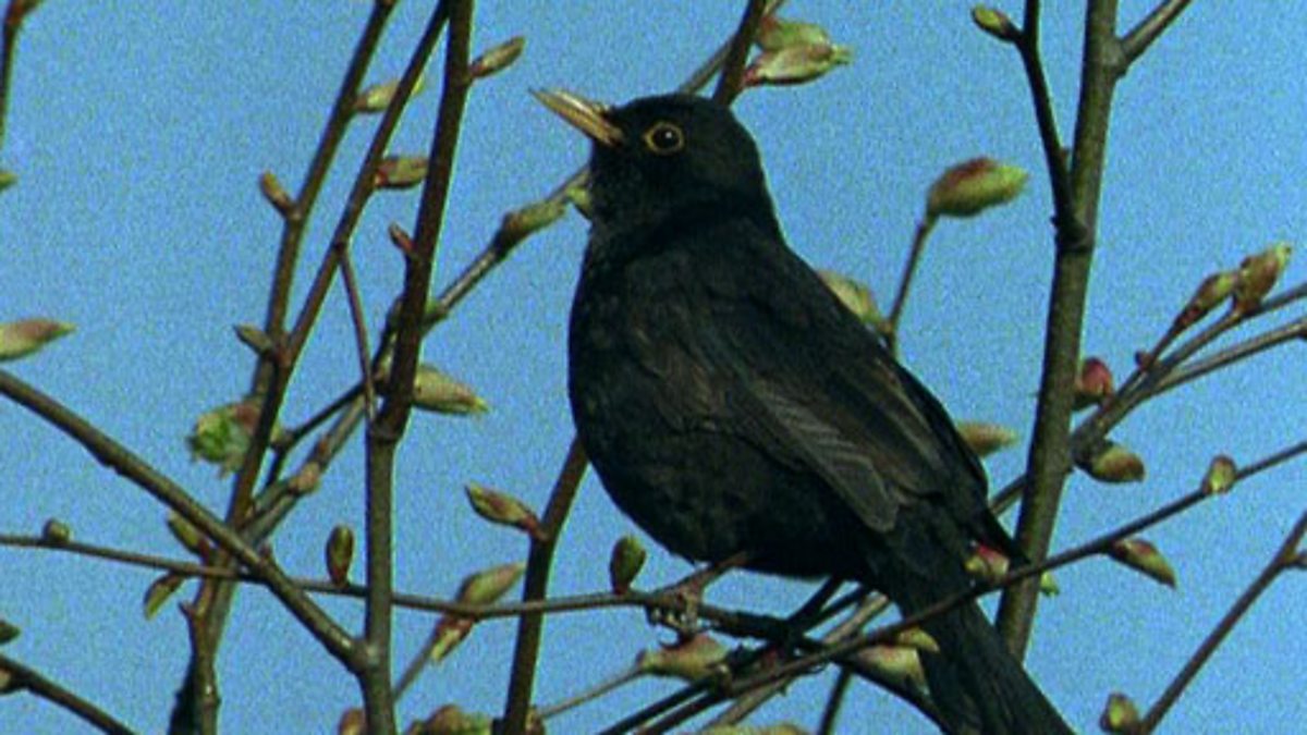 How blackbirds cope with the changing of the seasons. A male blackbird is singing to try to attract a female. The female is collecting twigs and grass to build a nest. A fortnight later there are four open-beaked chicks in the nest, waiting to be fed. The male blackbird listens for worms in the lawn. The young leave the nest during summer. By autumn only the male is left in the garden. It is hard for birds to find food in winter. The presenter builds a bird table to help. As spring arrives, the male blackbird sings once more.
