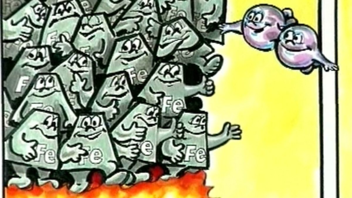 In this cartoon oxygen and iron atoms combine to form a new substance - iron oxide. Oxygen particles in the air around the hot iron wool are whizzing about looking for available particles to join with. When the oxygen particles come into contact with the hot iron particles they readily combine with them to form a completely new substance - iron oxide.