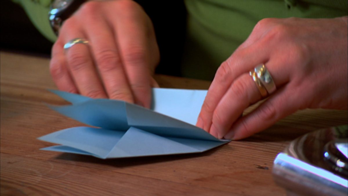 The ‘Origami Challenge’ is the game the Measures family is playing. The challenge is to fold a regular pentagon from an A4 piece of paper. The timer is set for the two-minute task. 'Penta' is explained as the Greek word for 5; 'pentagon' as five angles. A diagram and explanation give the properties of a pentagon. Images from the natural and man-made world show that there are pentagons all around us. After two minutes, Abi Measure is the only family member to succeed in making the regular origami pentagon. It is demonstrated how she achieved that. Three tasks follow: we are challenged to make our own pentagon; we are asked to explore how to investigate hidden triangles within the pentagon diagram; and finally we are challenged to find the sum of the internal angles using a protractor.