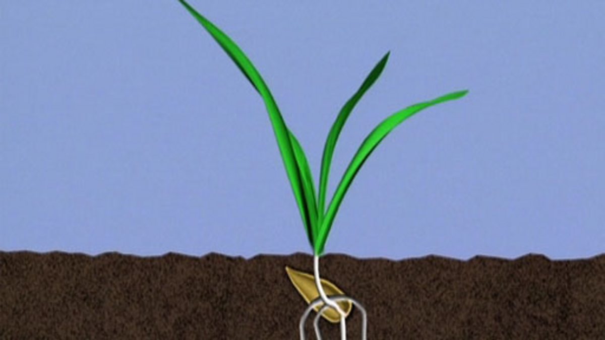 This clip shows how grass changes with the different seasons. It begins with the presenter recapping from the previous year and explaining that he noticed a bare patch in his garden so sowed some grass seeds. An animation demonstrates how the roots and shoots grow and that watering the grass helps growth. The presenter shows how he has to cut the grass in the summer. In the autumn and winter he notices how the grass has stopped growing. However, in springtime the grass is shown to grow again. The clip shows that animals who graze are given hay to feed on during the winter. At the end, the presenter recites a poem summarising the video.