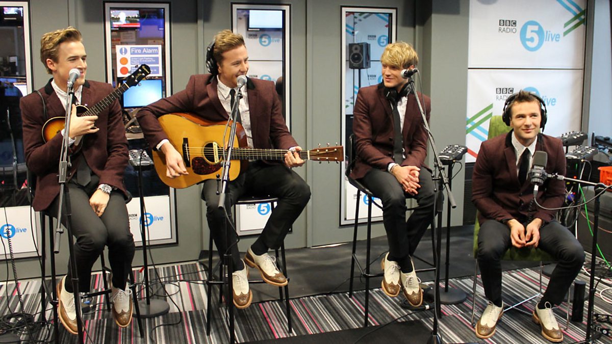 McFly set up in the Live Space to perform an acoustic version of "Love Is Easy".