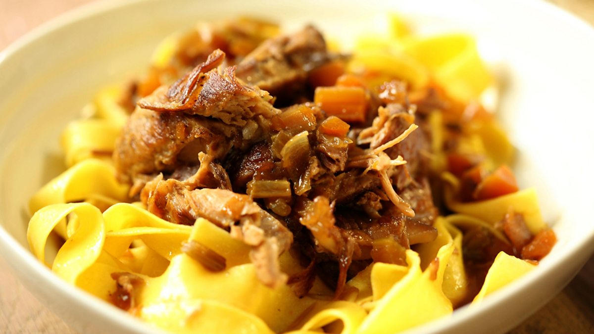 Pappardelle pasta is the perfect foil for a rich and unctuous ragù – made here with slow-cooked pork ribs.