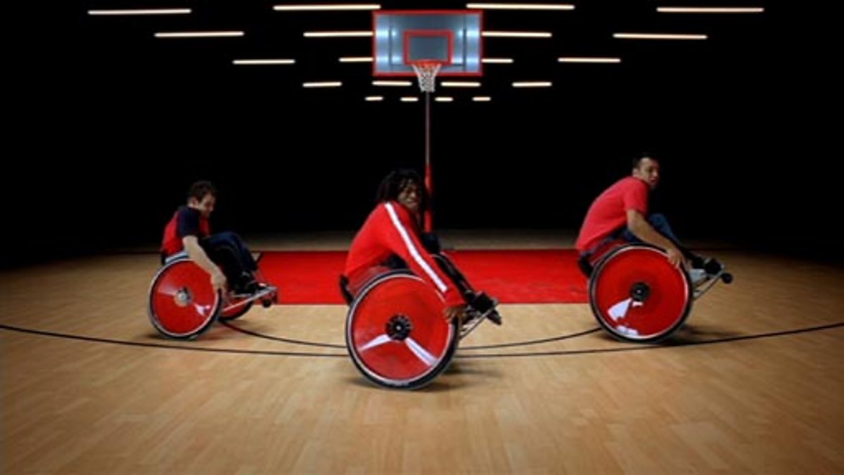 Wheelchair basketball is referenced in a choreographed sequence performed by three male dancers in wheelchairs. The set design evokes the markings and goal area of a basketball court. Three wheelchair dancers move in time to a piece of electronic music. The dance incorporates moves and gestures from basketball: turning, pivoting and reaching for the ball to score. The interplay between the dancers shows subtle changes in relationships and territorial areas.