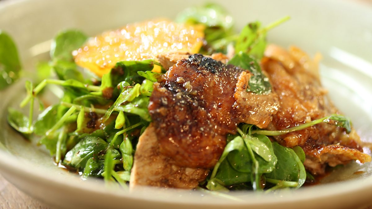 A light salad of orange segments and pea shoots makes a delicious accompaniment to roasted duck.