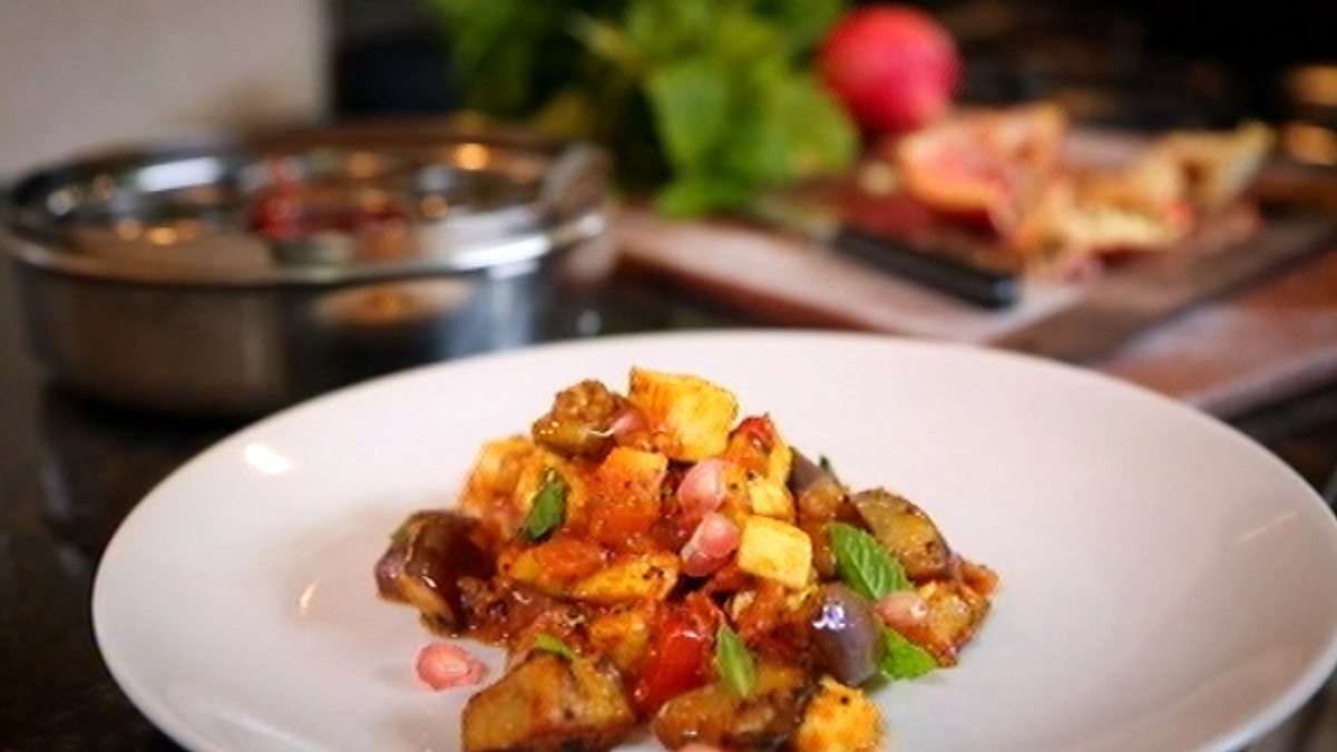 This incredibly quick and easy vegan curry looks impressive with its garnish of pomegranate seeds and torn mint.