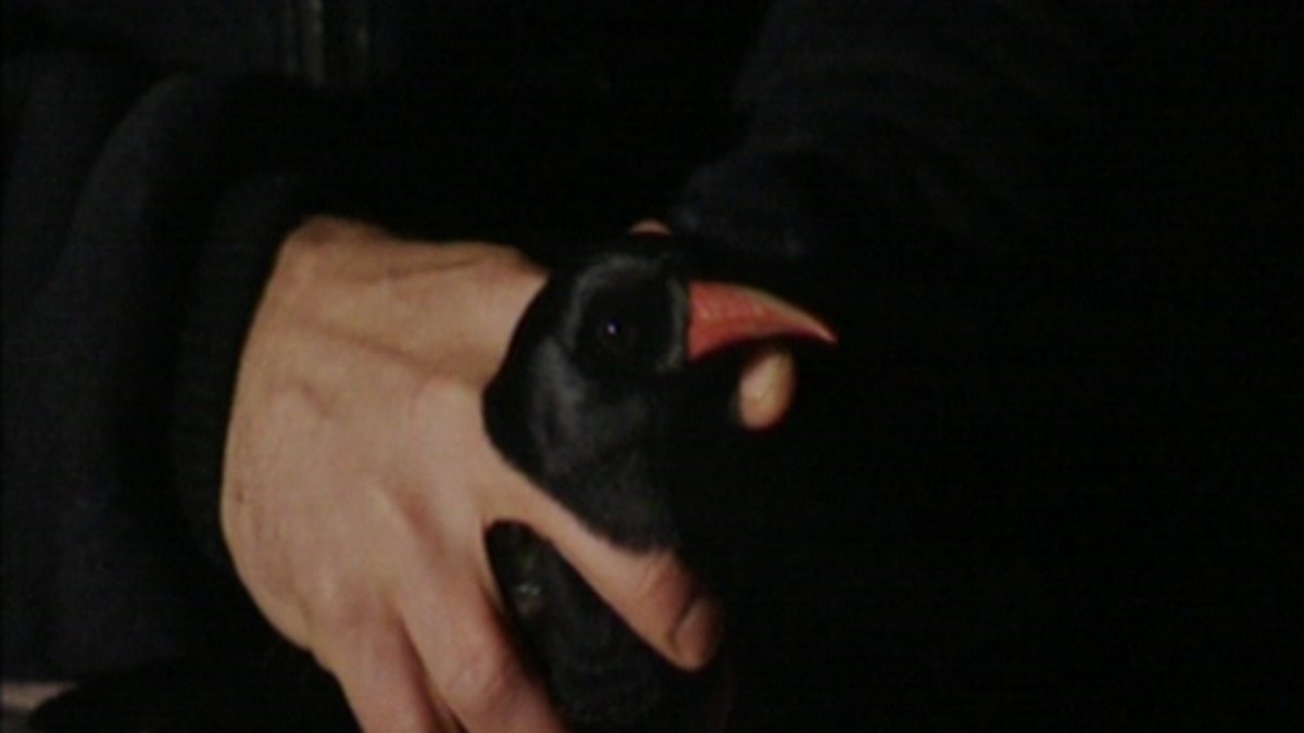 Discussion between Iolo Williams and a bird expert on a seaside bird - the chough. They focus on what the chough looks like, its unique smell, where it likes to live and what it feeds on.