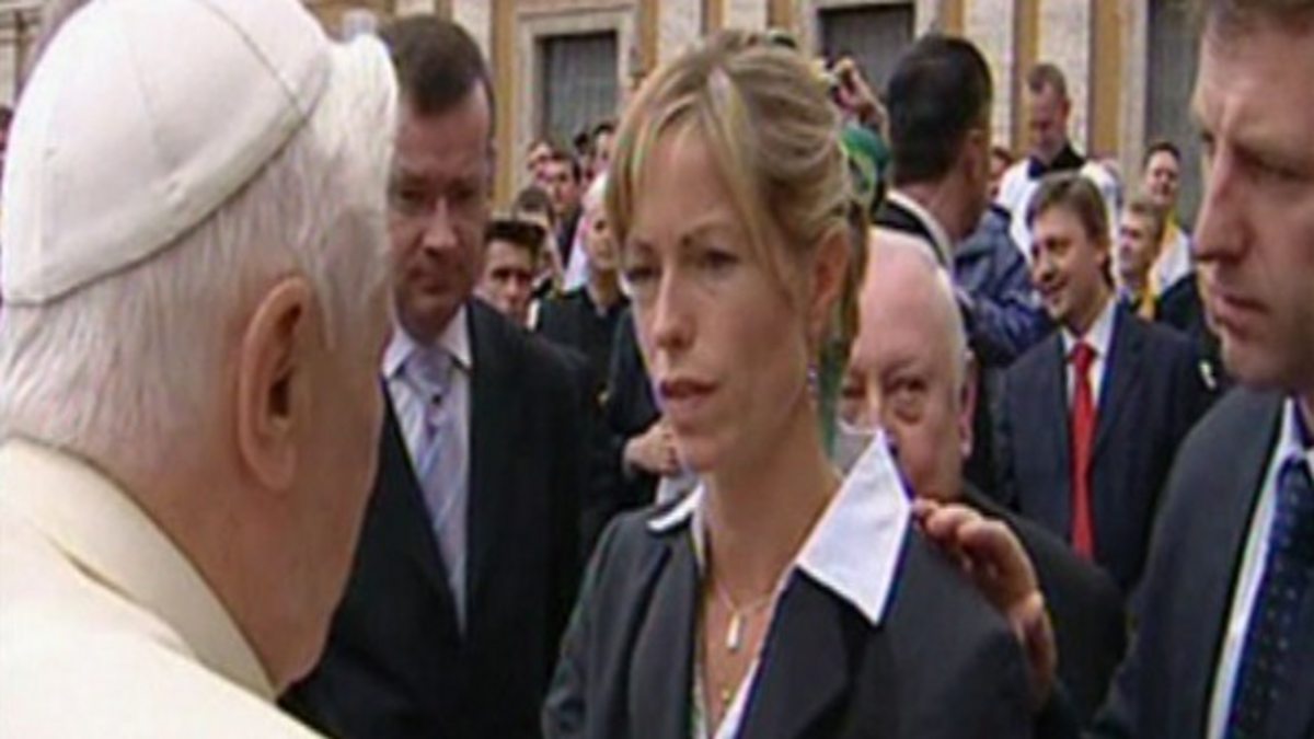 News report on Kate and Gerry McCann's visit to the Pope in Rome after the disappearance of their daughter Madeleine McCann from a holiday apartment in Portugal. Stresses the media interest and highlights a positive aspect of media power.