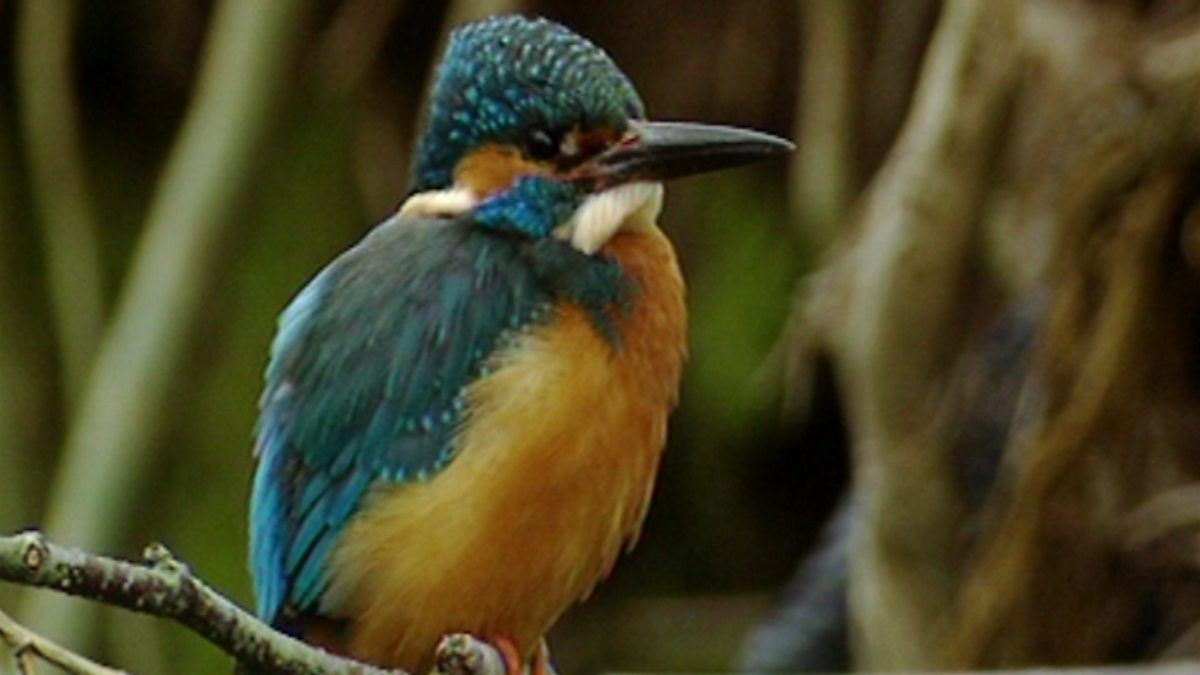 Iolo Williams looks at the habitat of the kingfisher, a beautiful bird that lays eggs in a nest at the end of a burrow in a river bank. The nest is identified by a circle of green algae surrounding it.