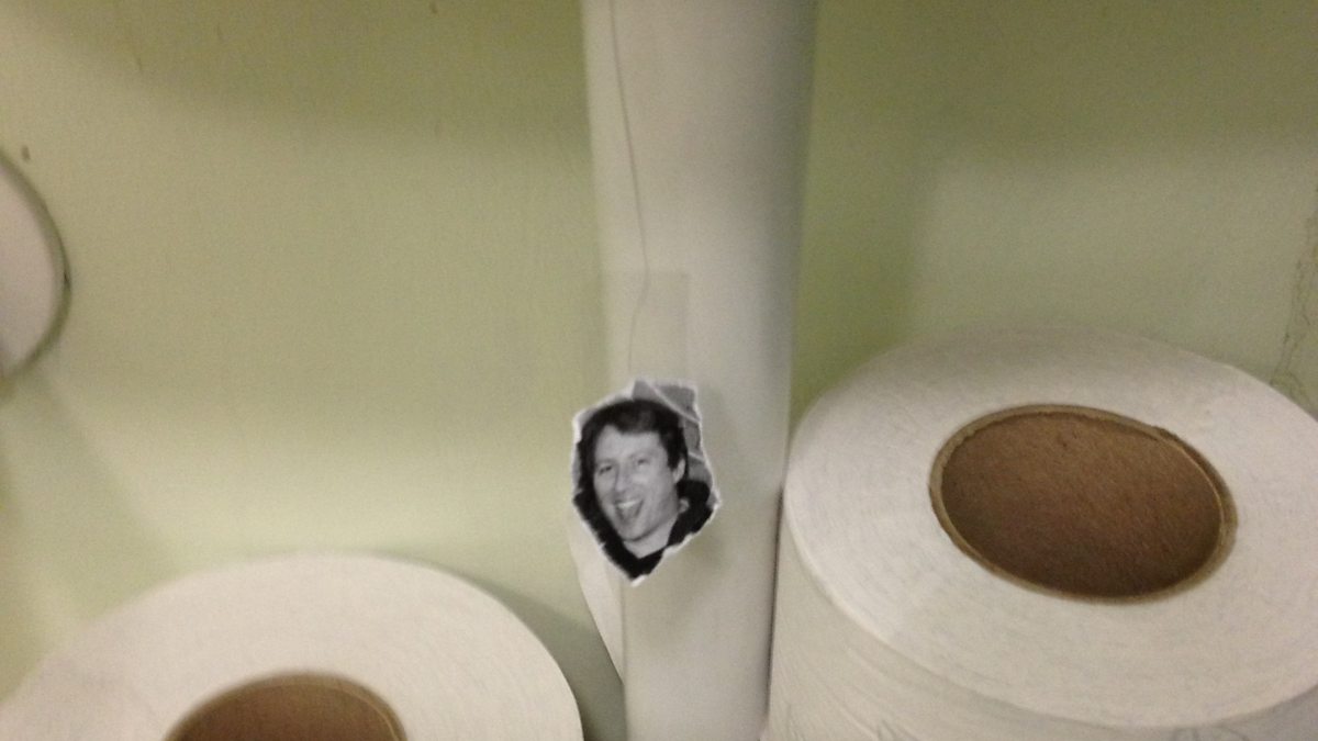 A person of questionable motives has taped a picture of Joe Cornish's face to Toilet Hair!