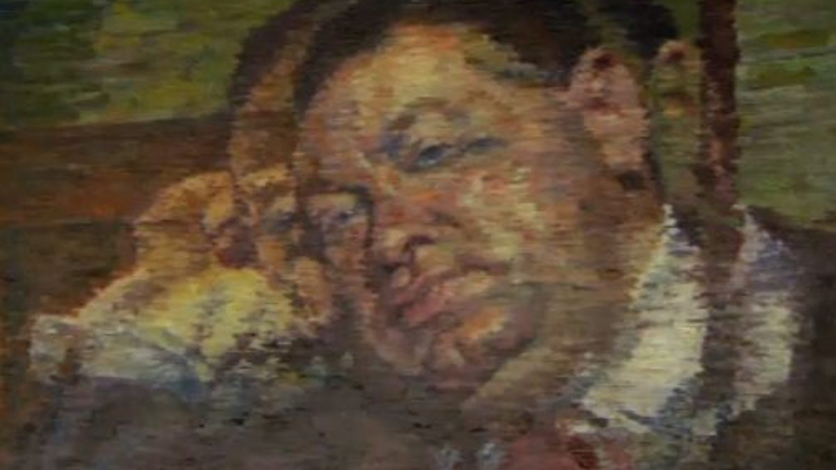 Black and white archive film with original commentary explaining the methodology behind double-image painting. The film shows Evan Walters painting a figure of a model using this technique. Presenter Kim Howells interviews conservation officer Emma Benz Fisher at Swansea's Glynn Vivian art gallery in front of one of Evan Walters' double-image paintings, Stout Man with a Jug, painted in the 1930s. Emma explains how parts of the image are repeated - hand, eye, etc. and that this gives an effect of movement. She suggests that this may have been his response to the experimentation taking place in art at the time; his stab at modernism. Emma shows one simple step in cleaning a painting of this age and condition, simply using a cotton bud and a little saliva.