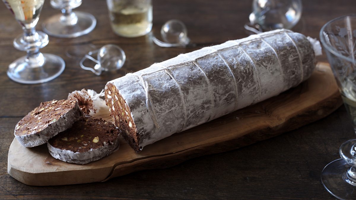 I’ve encountered quite a few versions of chocolate salame in Italy – coming to the conclusion that it’s really an Italian version of our chocolate refrigerator cake. I am grateful here to Jacob Kenedy for his instructions on how to string up a finocchiona in the Bocca Cookbook.