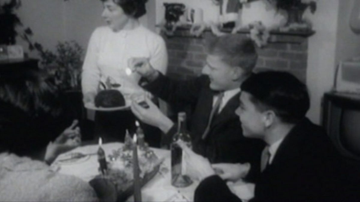 Includes archive of a family Christmas dinner, with the whole family sitting around a large table plus the tradition of lighting the Christmas pudding. After dinner, presents would be looked at, while older members of the family go to sleep in front of the fire.