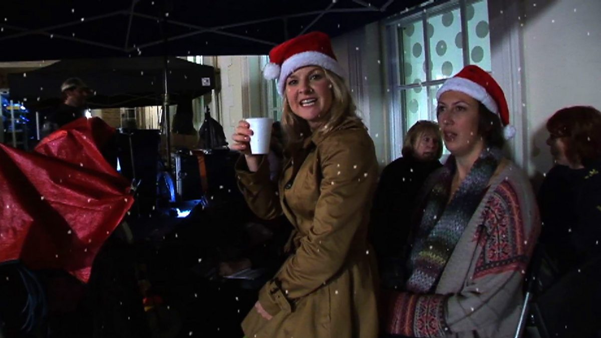 Miranda Hart and Sarah Hadland take a break from filming to sing a little song.