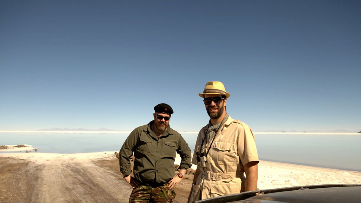 Phill Jupitus & Marcus Brigstocke drive into the salt lake of Uyuni, part of the world's largest salt plain, visible from space. As they tentatively make their way into the lake, Phill glides the car along while Marcus hangs out of the window, taking in the landscape.