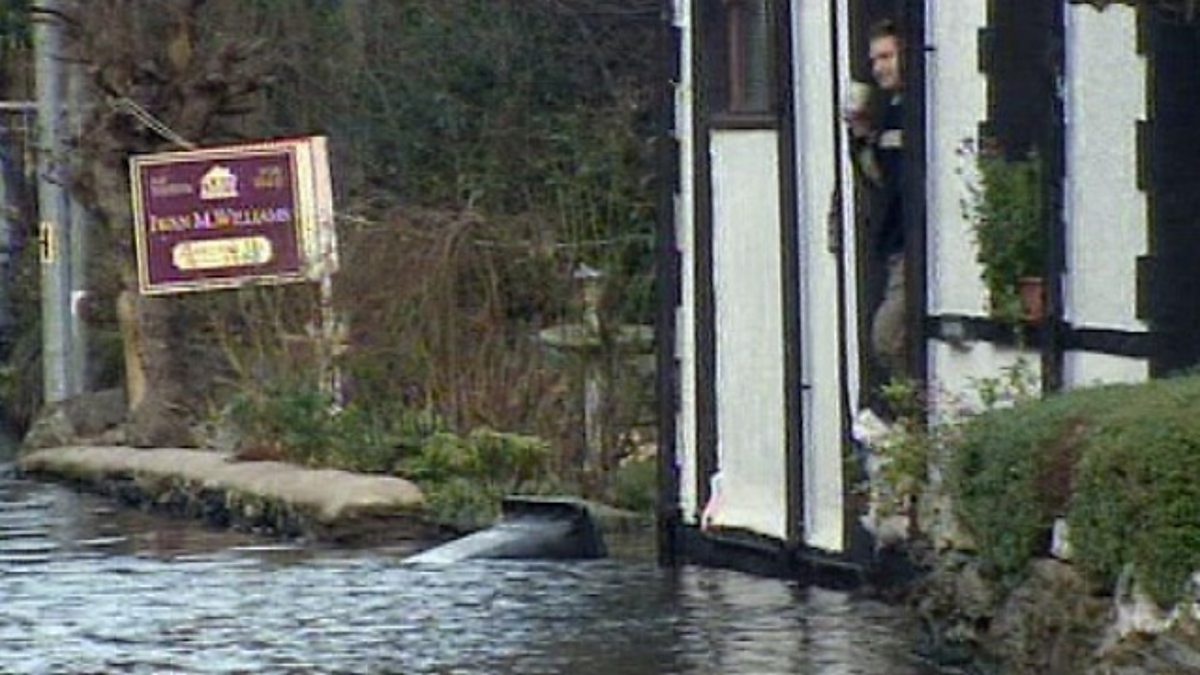News report on the floods in the Conwy valley in 2005 showing the scale of the flooding. One local resident is interviewed on how he was affected and the likelihood of a repeat flooding is assessed due to factors associated with climate change and global warming.