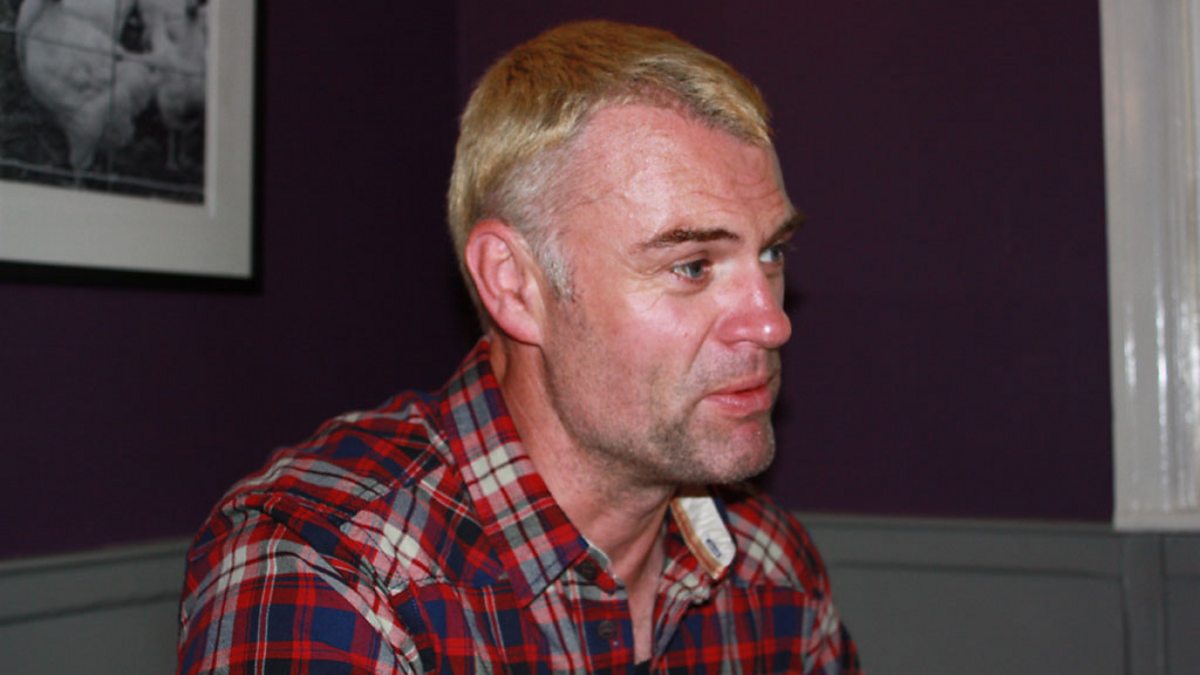 Yr actor Julian Lewis Jones yn y stiwdio gyda Dafydd a Caryl.