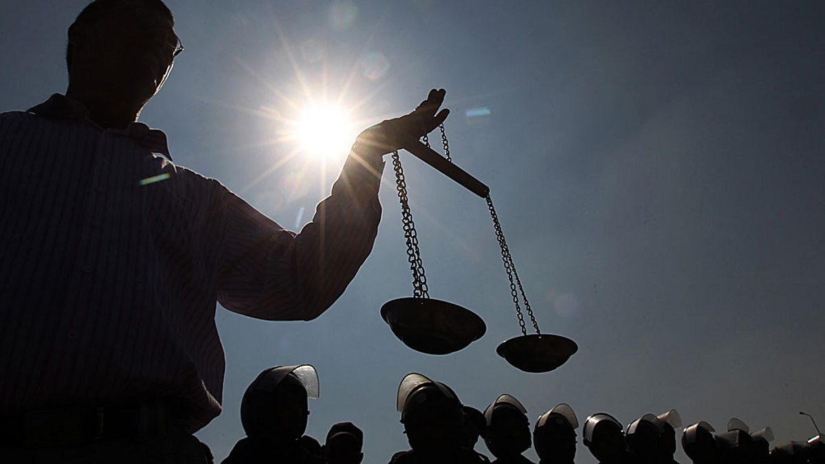 (Image: A man holds some scales, riot police in the background, Credit: Khaled Desouki/AFP/Getty Images)