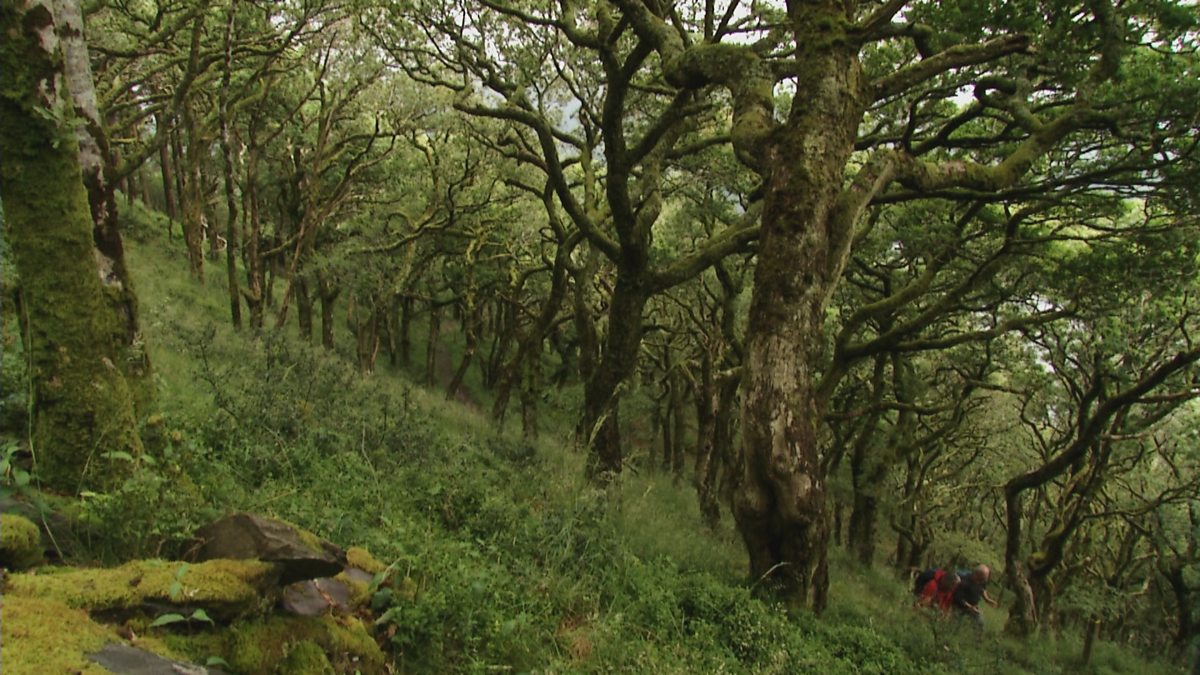 Derek and walk guide Rhys Mwyn wind their way up through the beautiful sessile oak woodland of the Padarn Country Park. These trees are stunted oaks that grow in thin soil and contribute to this being designated as a Site of Special Scientific Interest. Sessile oaks used to grow on many of the lower slopes of the mountains of Snowdonia until sheep farming came along. Now only small pockets grow here and there in areas that were difficult to cultivate as pasture.