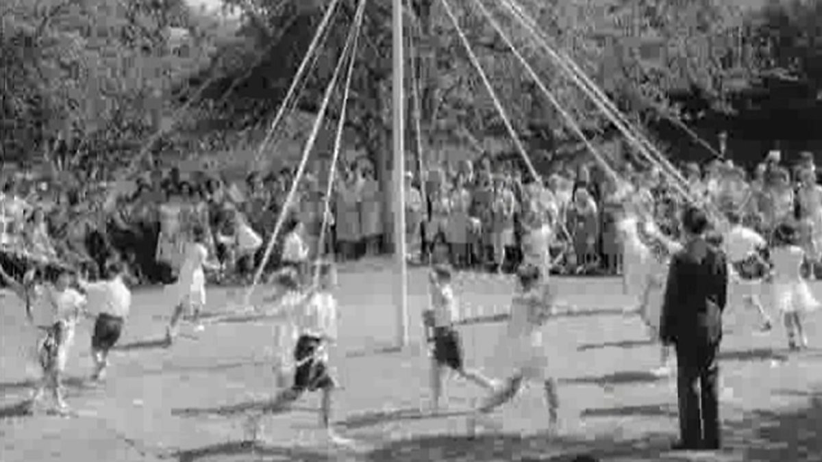 This Children's Newsreel item records the crowning ceremony of a May Queen in the Devonshire village of Lustleigh, a tradition which continues today. Dating back to Roman times, the ceremony involves a procession through the streets, the crowning of a young May Queen beneath a canopy of flowers and, finally, some traditional maypole dancing. Miss Mabel Bunclark, who was the May Queen in 1905, also joins the celebrations.