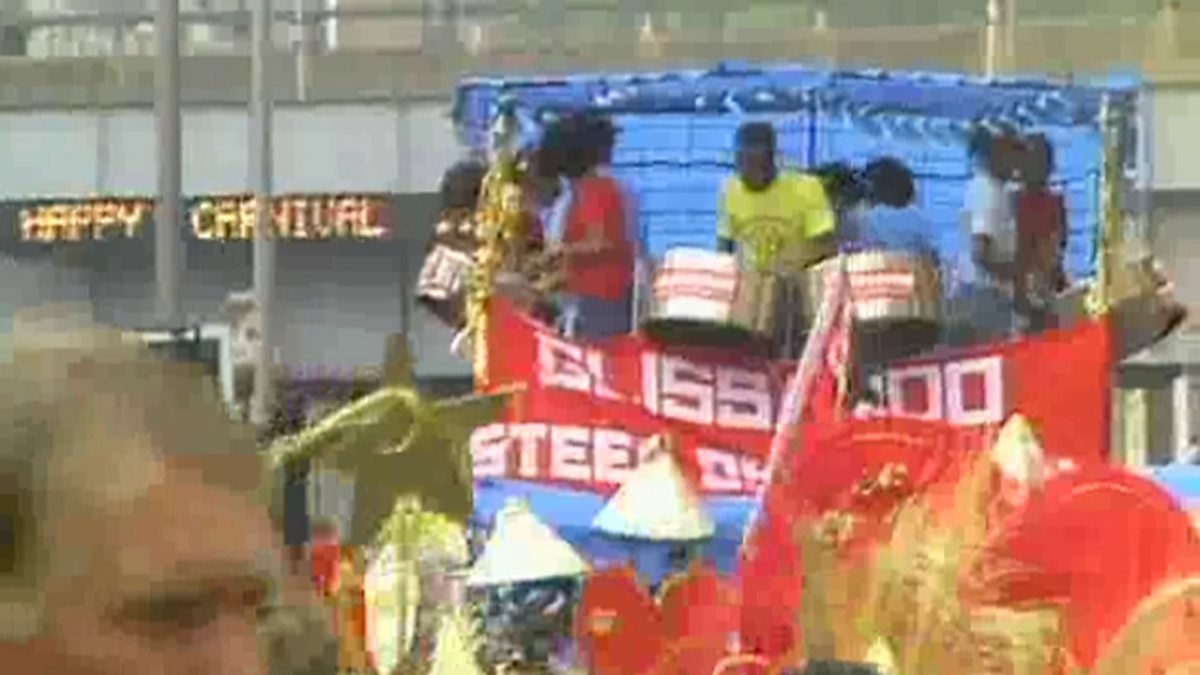 Dancing policemen, steel bands and floats all feature in this news report about a successful day on the newly expanded carnival route. The Metropolitan Police Band plays, the children smile and a good time is had by all.