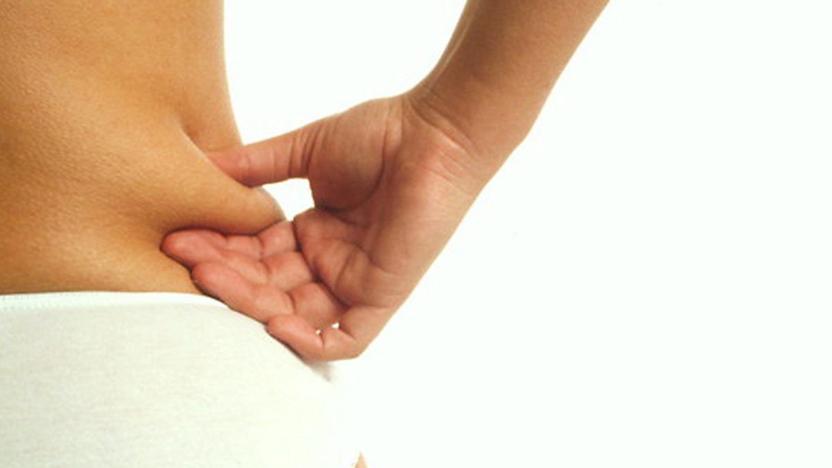 (Image: Woman pinching 'spare tyre' on her waist. Credit: Science Photo Library)