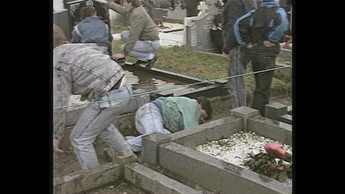 Terrified mourners hide from a loyalist gunman as he attacks a funeral in Milltown Cemetery. A funeral car rushes casualties to hospital in the aftermath of the attack. Sinn Fein president Gerry Adams appeals for calm.