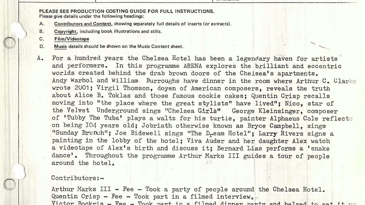Browse some of the original production documents from the film, The Chelsea Hotel.