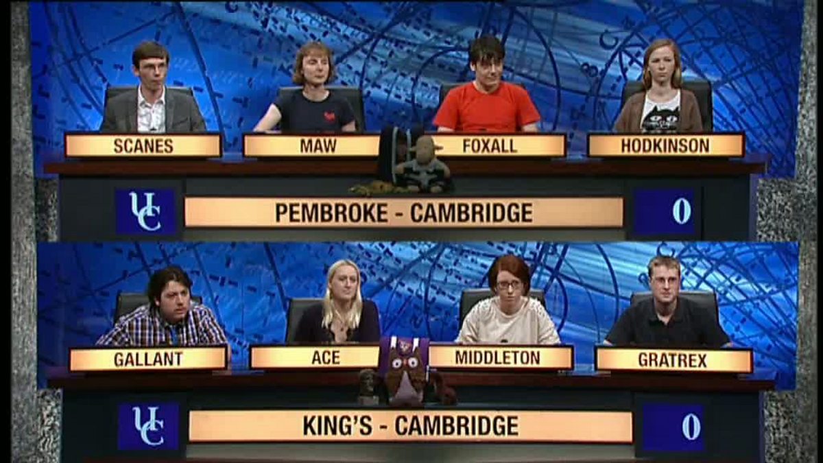 Pembroke College, Cambridge, plays King's College, Cambridge, and King's College answer questions on an adjective and the year 1565.