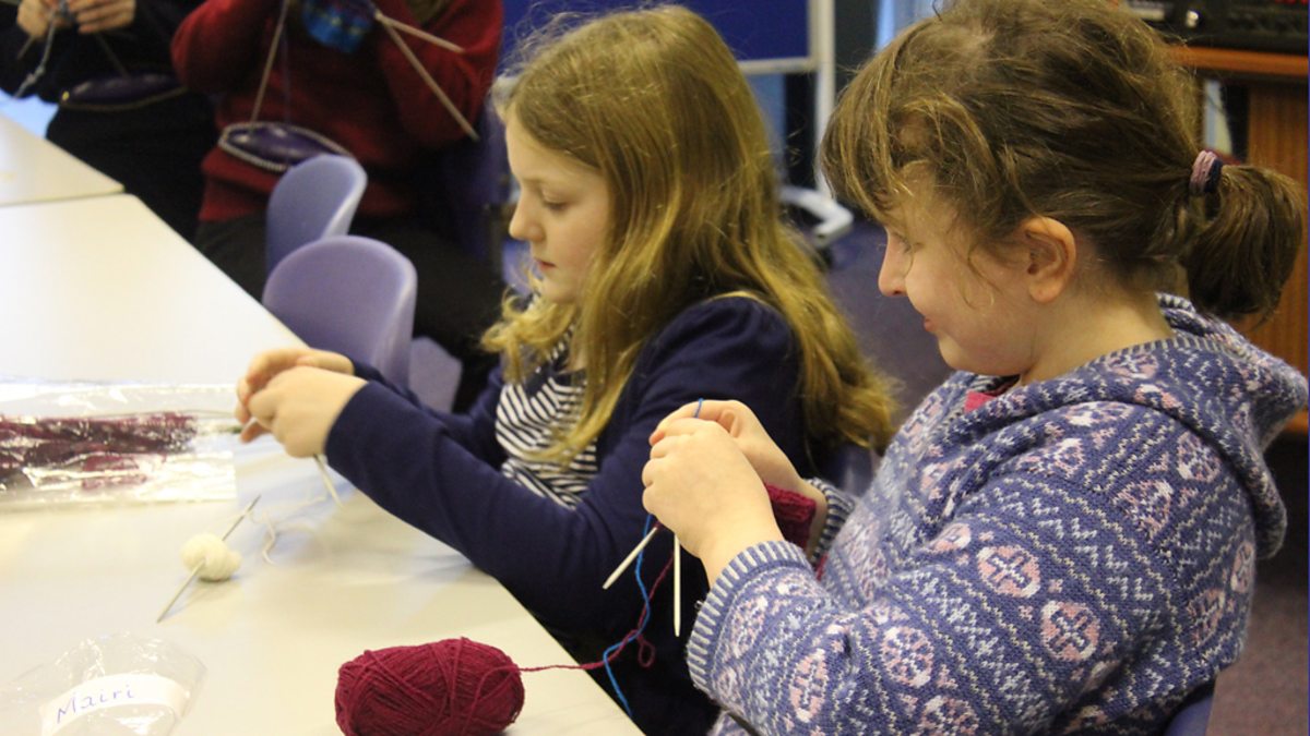 A school knitting club share the differences between knitting in Victorian Shetland and present day by trying out lace knitting and visiting a wool broker.