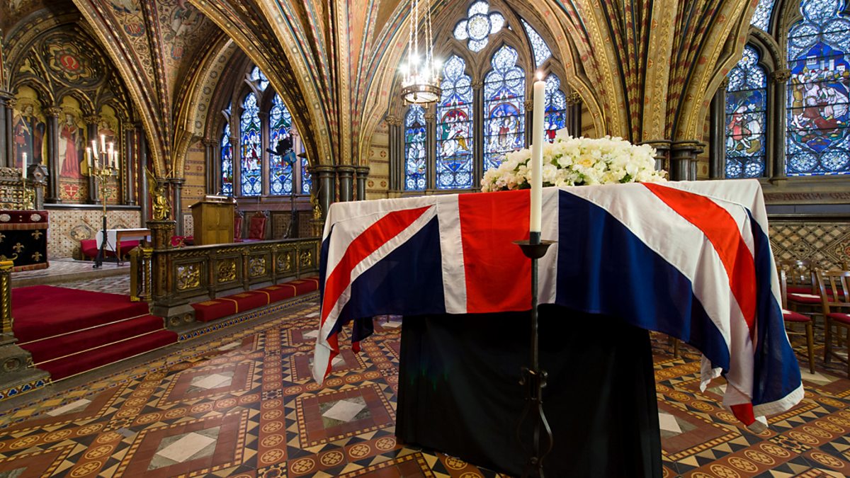 (Image: The coffin of former British prime minister Margaret Thatcher. Credit: Leon Neal - WPA Pool/Getty Images)