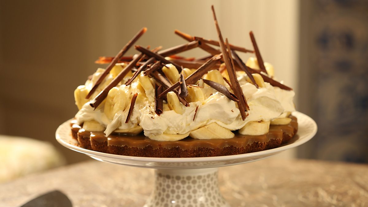 With its fantastic combination of banana and toffee, banoffee pie is hard to beat. This one has a chocolate biscuit base and is made on the hob rather than boiling the condensed milk in the can for hours.