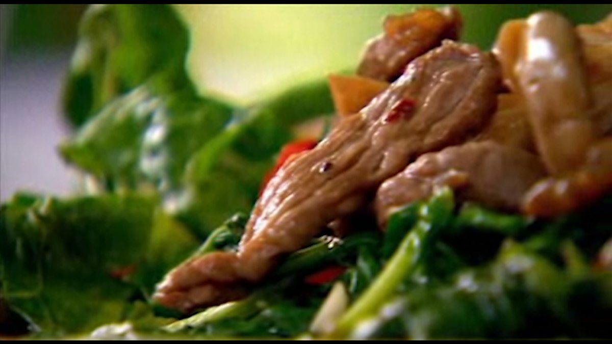 Ching He Huang demonstrates a classic stir-fried beef recipe with oyster mushrooms.