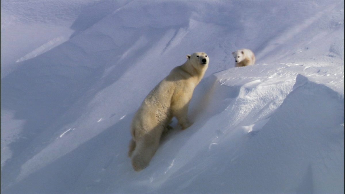 A family of polar bears explore the icy cold surroundings of their Arctic home.