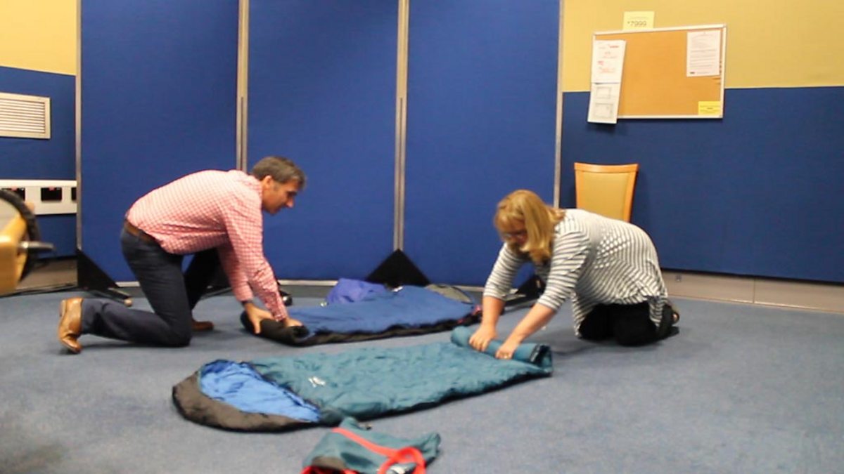 Pa un o'r ddau sy'n gallu cael y sach gysgu i nôl i mewn i'r bag yn gyntaf?