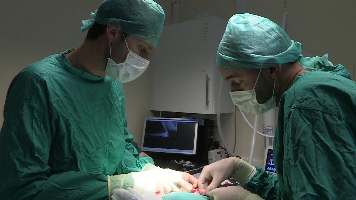 Vets David and Gareth team up in theatre to save a tiny dog's leg