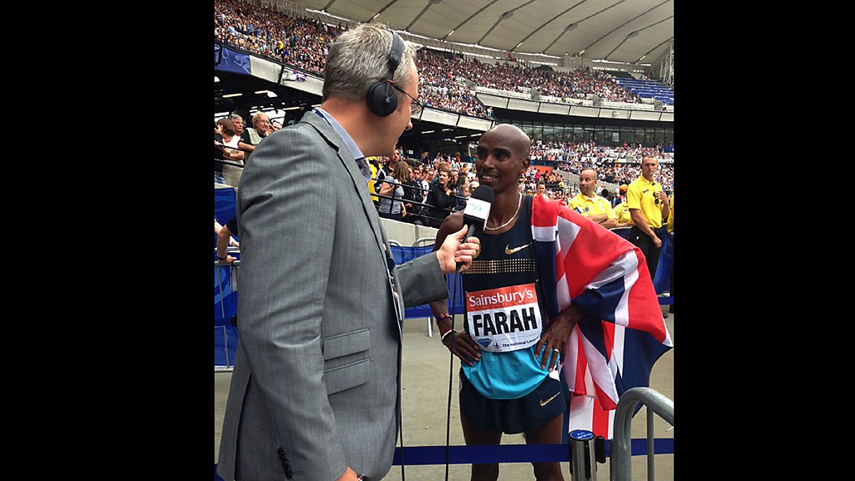 Mike Costello commentates as the double Olympic gold long distance runner beats his personal best in the 3000m at the London Anniversary Games.