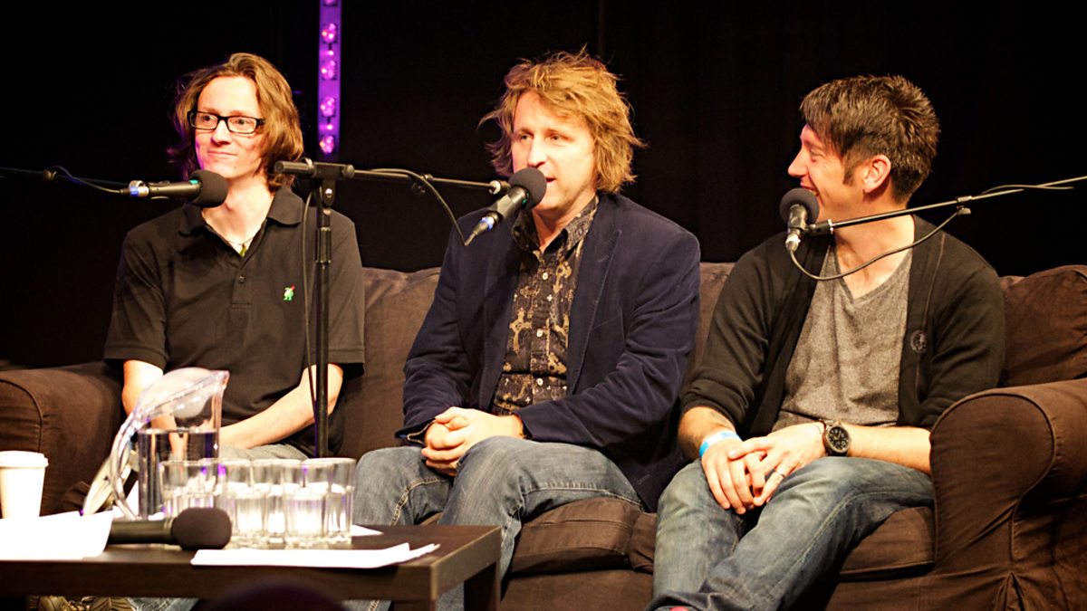 Ed Byrne, Milton Jones and The Boy with Tape on his Face partake in some hilarity on the MacAulay and Co. sofa.