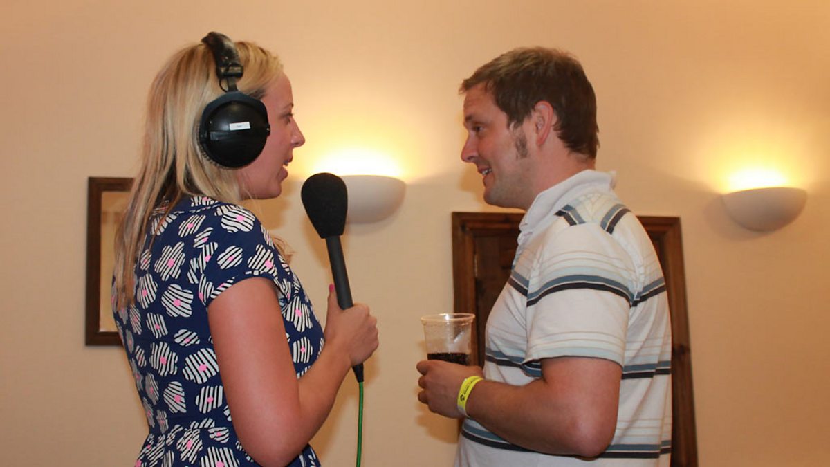 Magi Dodd yn sgwrio gyda Dan Amor ar ol gig Cymdeithas yr Iaith Eisteddfod Dinbych.