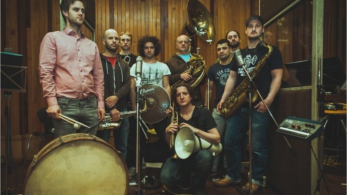 Huey meets the funky brass ensemble, The Hackney Colliery Band