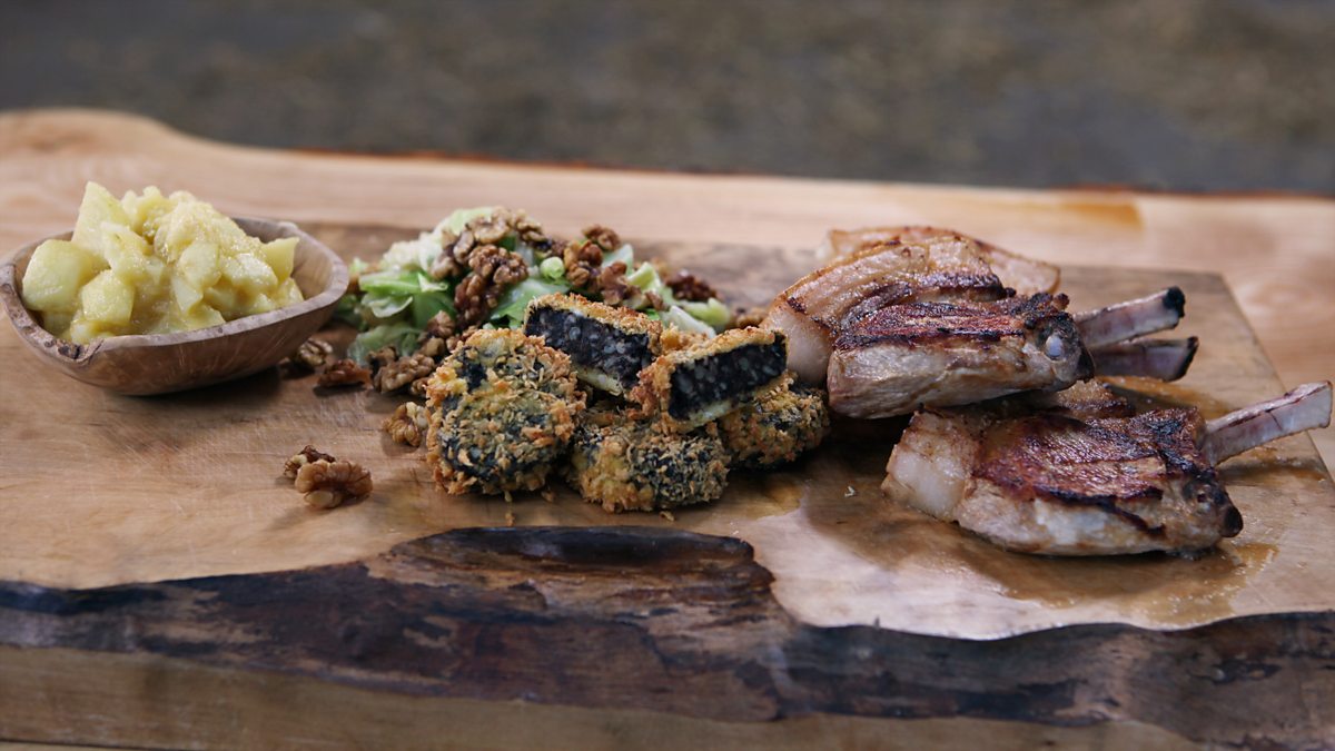 This recipe for loin of pork with scrumpy sauce, candied walnuts, crisp black pudding and hispi cabbage shows how pork chops aren't just for midweek meals. Find out how to turn them into something really special.