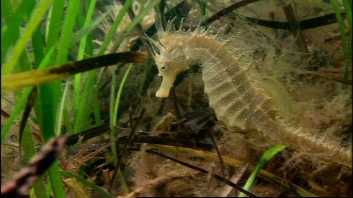 A female spiny seahorse releases her eggs into a male after being wooed by his fancy finwork.