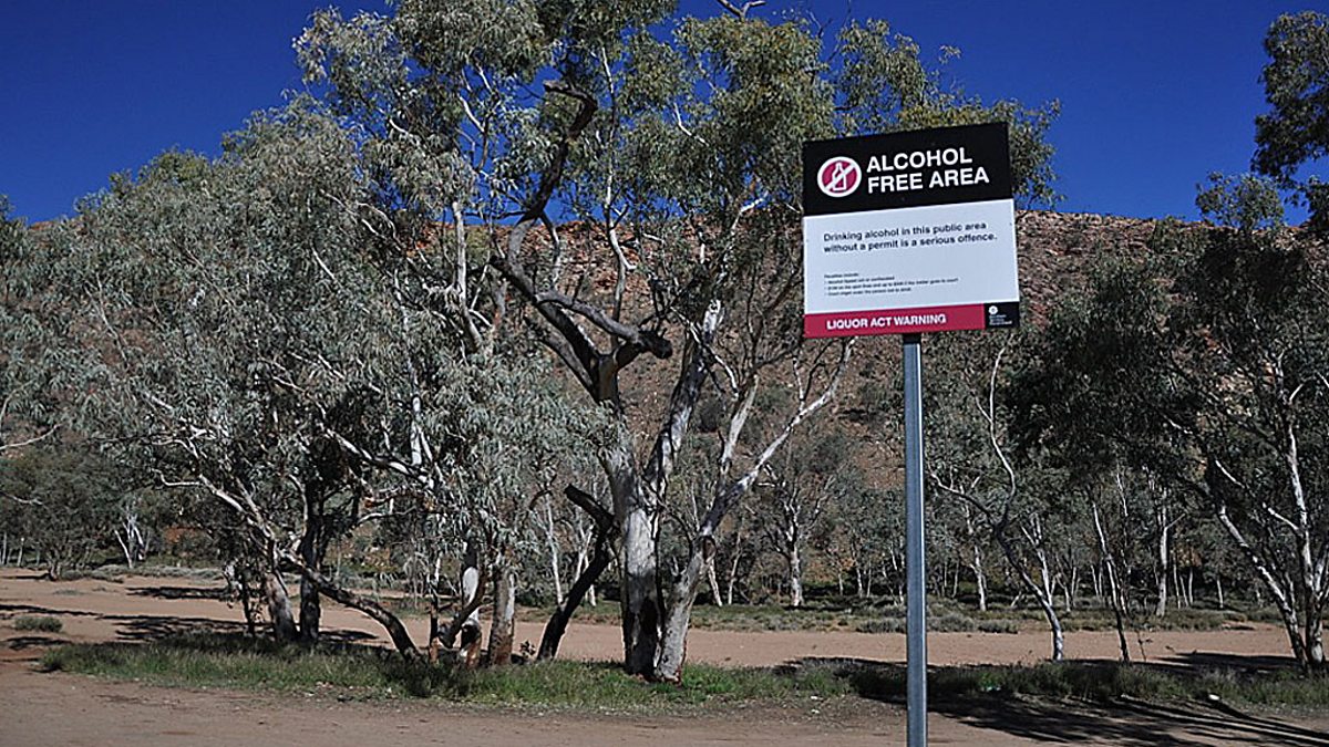 (Image of an alcohol free area sign in Alice Springs. BBC Copyright)