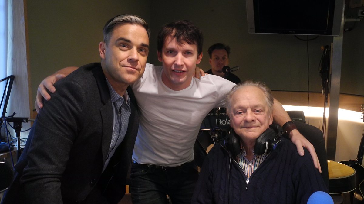 James Blunt sings You're Beautiful with Robbie Williams and Sir David Jason looking on.