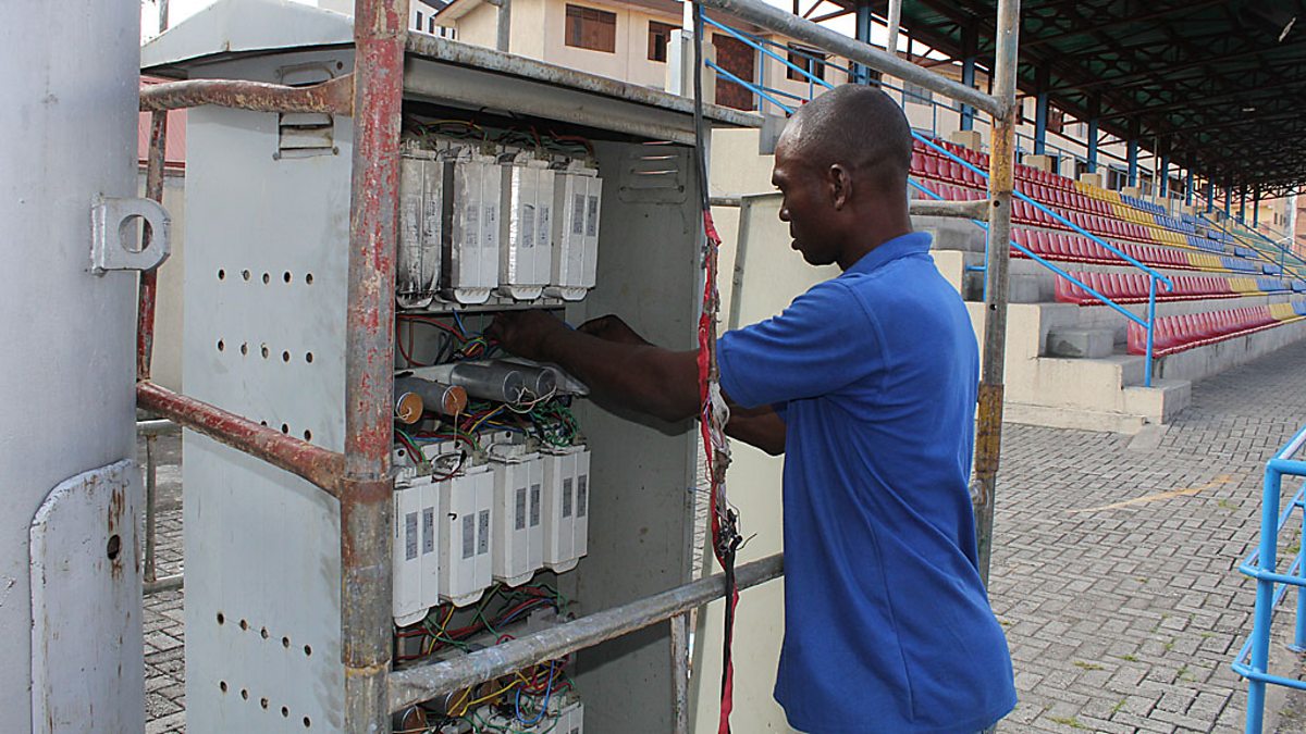 (Image: An engineer fixing the lights from an electrical box in Lagos. BBC Copyright)