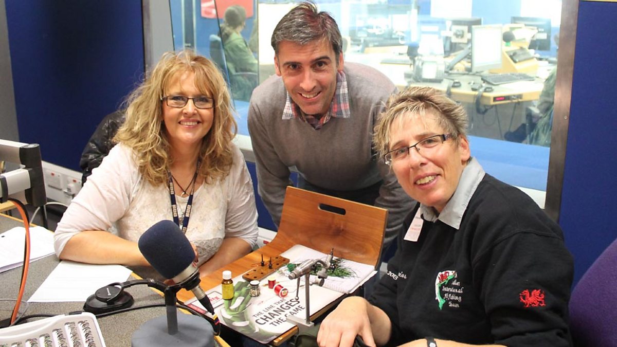 Alice Davies, capten tîm pysgota merched Cymru, yn clymu plu ar raglen Dafydd a Caryl.