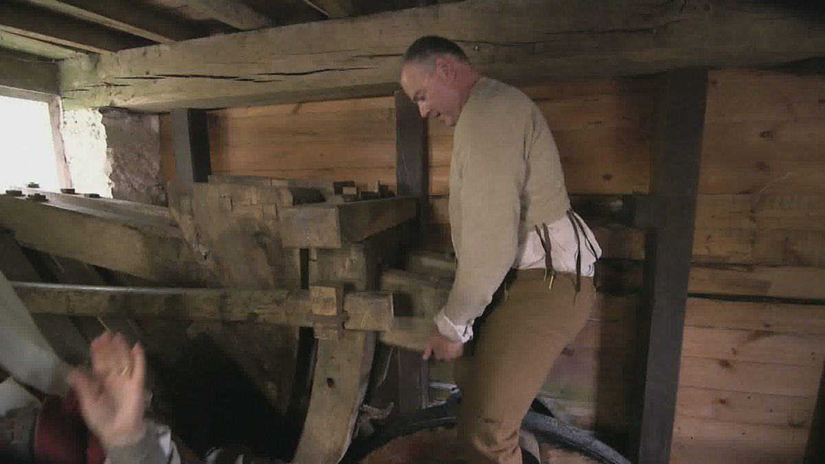 Ruth takes her home-spun cloth to the monastery's mill to be fulled, a process that involves manipulating it with giant water-powered hammers.