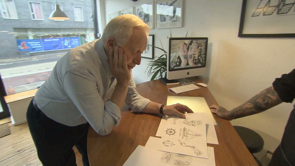 David Dimbleby browses through a number of possible tattoo designs (including a Question Time one) before making his final selection.
