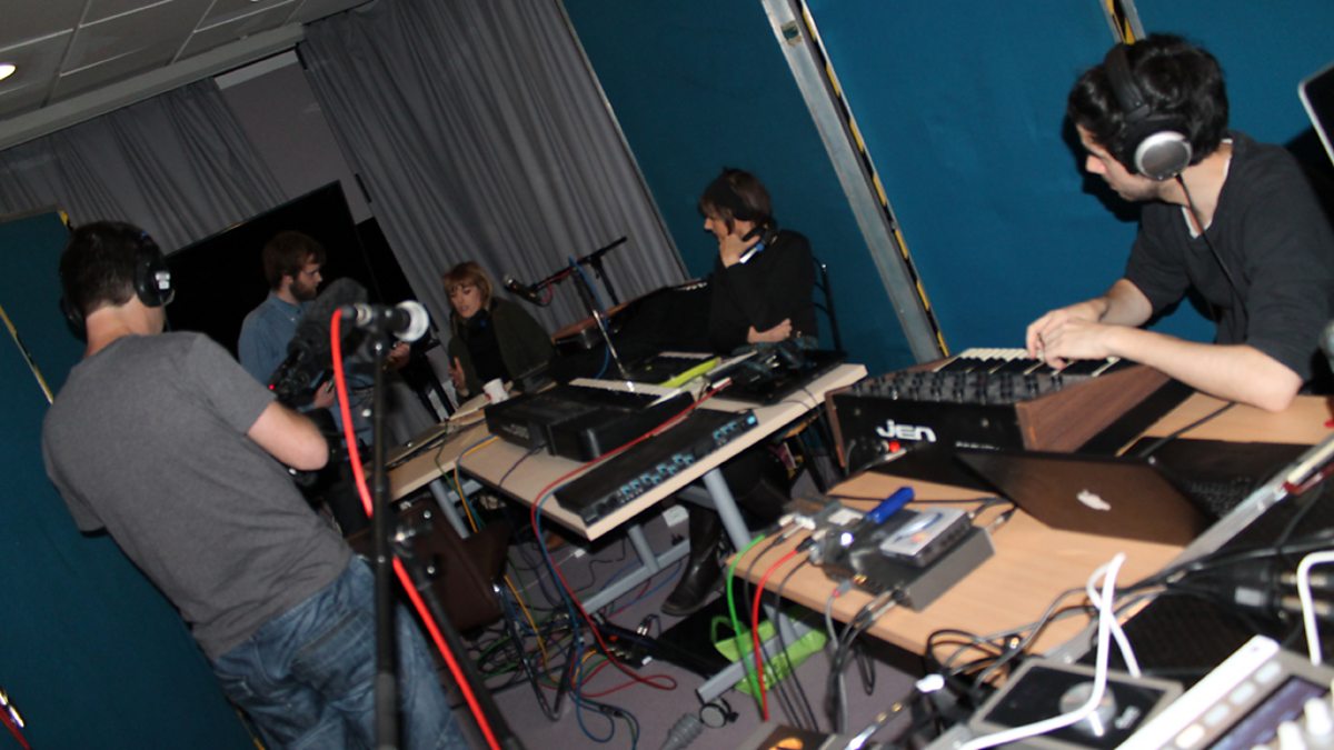 Griff Lynch yn siarad gyda'r criw ar ol recordio trac un.