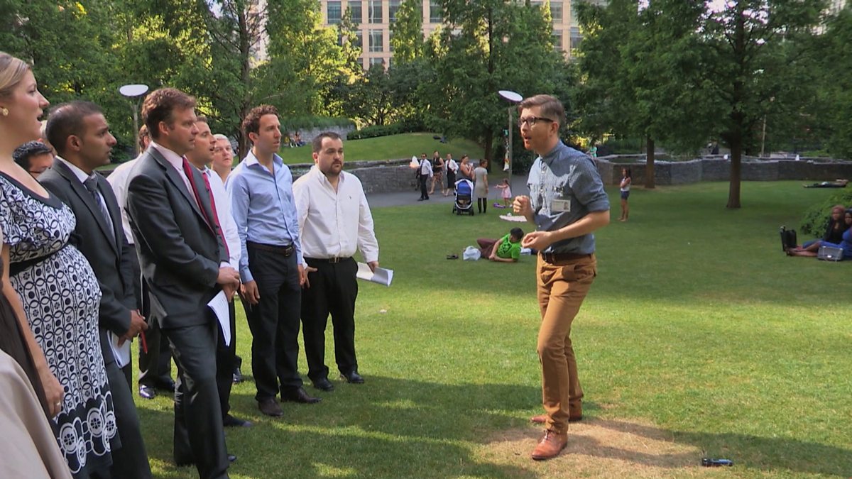 Gareth and the choir rehearse in the park to understand the meaning of U2's song 'One'.