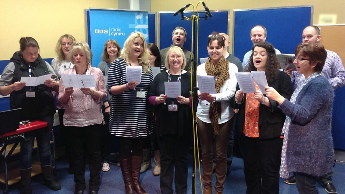 Côr swyddfa Radio Cymru ar raglen Dafydd a Caryl yn canu Ar Gyfer Heddiw'r Bore.